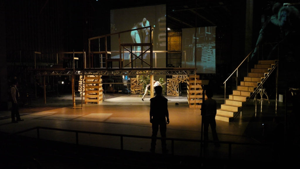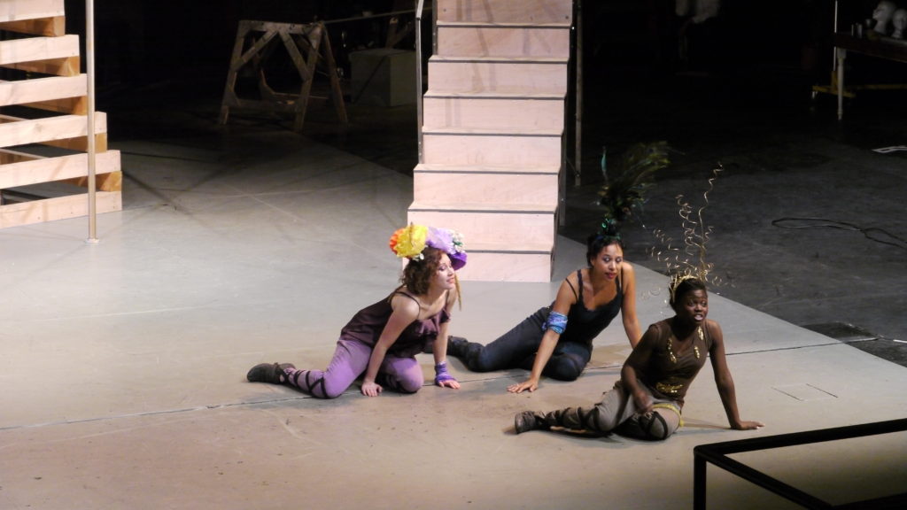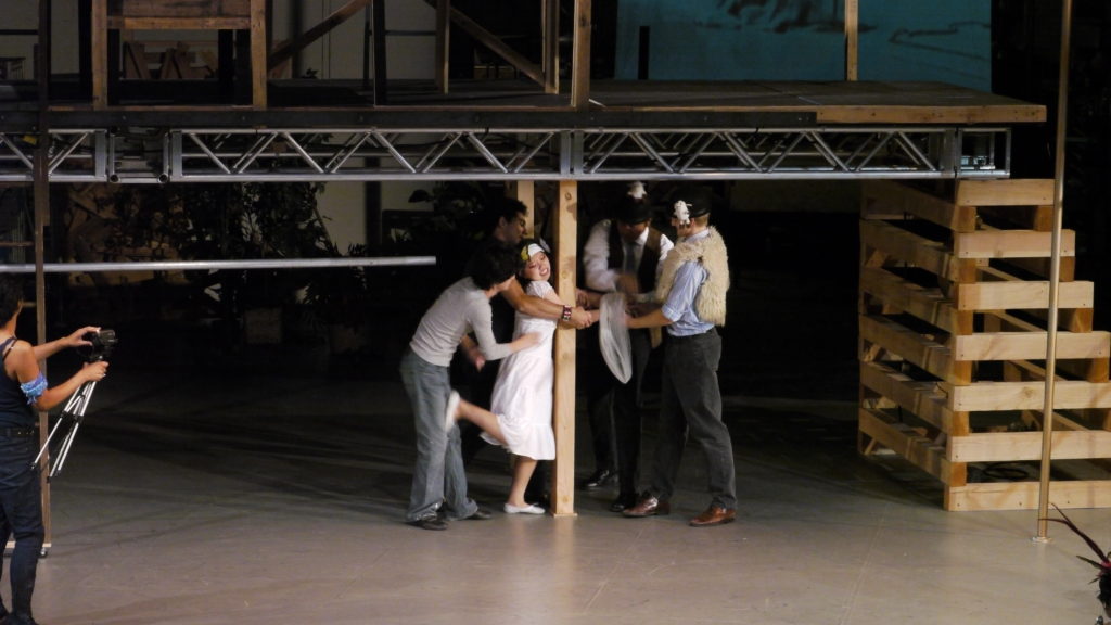 Gallathea (2010-11) by John Lyly, a predecessor of Shakespeare. This was a genuine experiment directly in collaboration. I worked with the international dance/theatre performer Keith Hennessy (http://circozero.org/current), the Hollywood costume designer Liz Galindo (who had just finished There will be blood and Benjamin Buttons), the videographer/filmmaker/actor John Zibell, and Dylan Bolles, a fabulous musician who brings together Japanese musical instruments and United States folksong (he installed a classical Asian drone instrument that the actors interacted with throughout the performance – random tonal music…). All four were listed as co-directors of the production, and worked with each other and with me to create and build the show with a young set designer Gian Scarabino. It was an amazing piece, but met with extraordinary resistance because the one thing I was working against was the character psychology that usually gets loaded on to early modern theatre. I felt it was a play written before modern ideas of ‘identity’ and that sexuality was also framed in a completely different way (the play pivots around two women, one dressed as a man, who fall in love), in other words a kind of pre-post-dramatic play that had lots of potential for current theatricality. There was a lot of full-frontal actor-audience engagement, and the projection mapping was partly by the videographer and partly by actors in the play – cameras were left around the set and they could pick them up and use them as they wished.