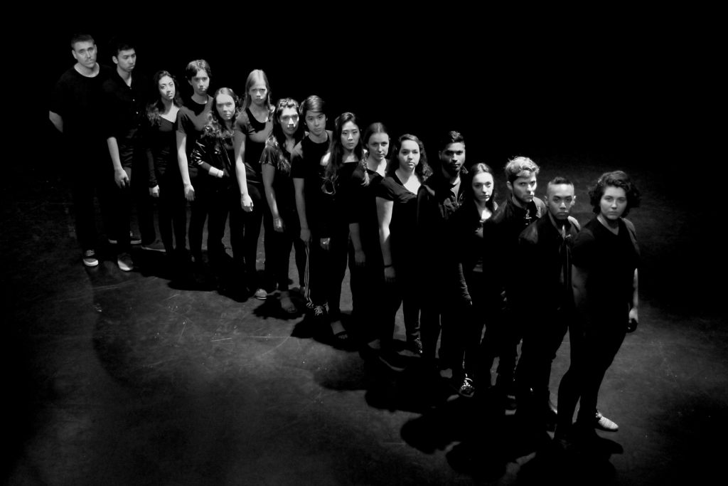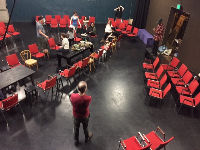 The cast was in trans-gender casting – extending from my experiments with single-sex casting of the play 20 years before. Staged in an arena theatre space, so there could be no authoritative point of view, the audience continued to be the main character in the production. Actors’ were playing the situation with each other/ with the audience, rather than “inhabiting” characters. All scenes were simultaneously rehearsed in the room. I pursued the collaborations that I had started in my other productions out to the actors who took responsibility for costumes, props, music, the stage furniture, programs.