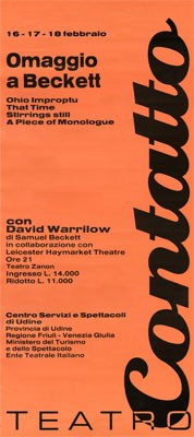 Plays I scheduled and produced included: Shakespeare’s Julius Caesar and Stephen Spender’s Creon, both of which were directed by John Dexter and designed by Jocelyn Herbert, and after visiting the Belfast Festival went on a major British Council tour of India; M. Butterflyby David Henry Hwang, again directed by John Dexter and designed by Eiko Ishioka, starring Anthony Hopkins, which transferred to the Shaftsbury Theatre in London’s West End; Samuel Beckett’s Krapp's Last Tape and Catastrophe starring David Warrilow which were the last productions that Beckett had a direct involvement with before he died – they played at London’s Riverside Studio and were televised by BBC before going to the Festival D’Automne in Paris and Brooklyn’s Next Wave Festival; Yuri Lyubimov’s production of Hamlet which toured extensively around the world including: Rome, Berlin, London, Adelaide and Tokyo.